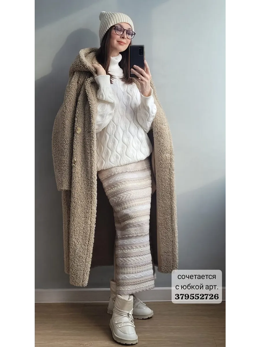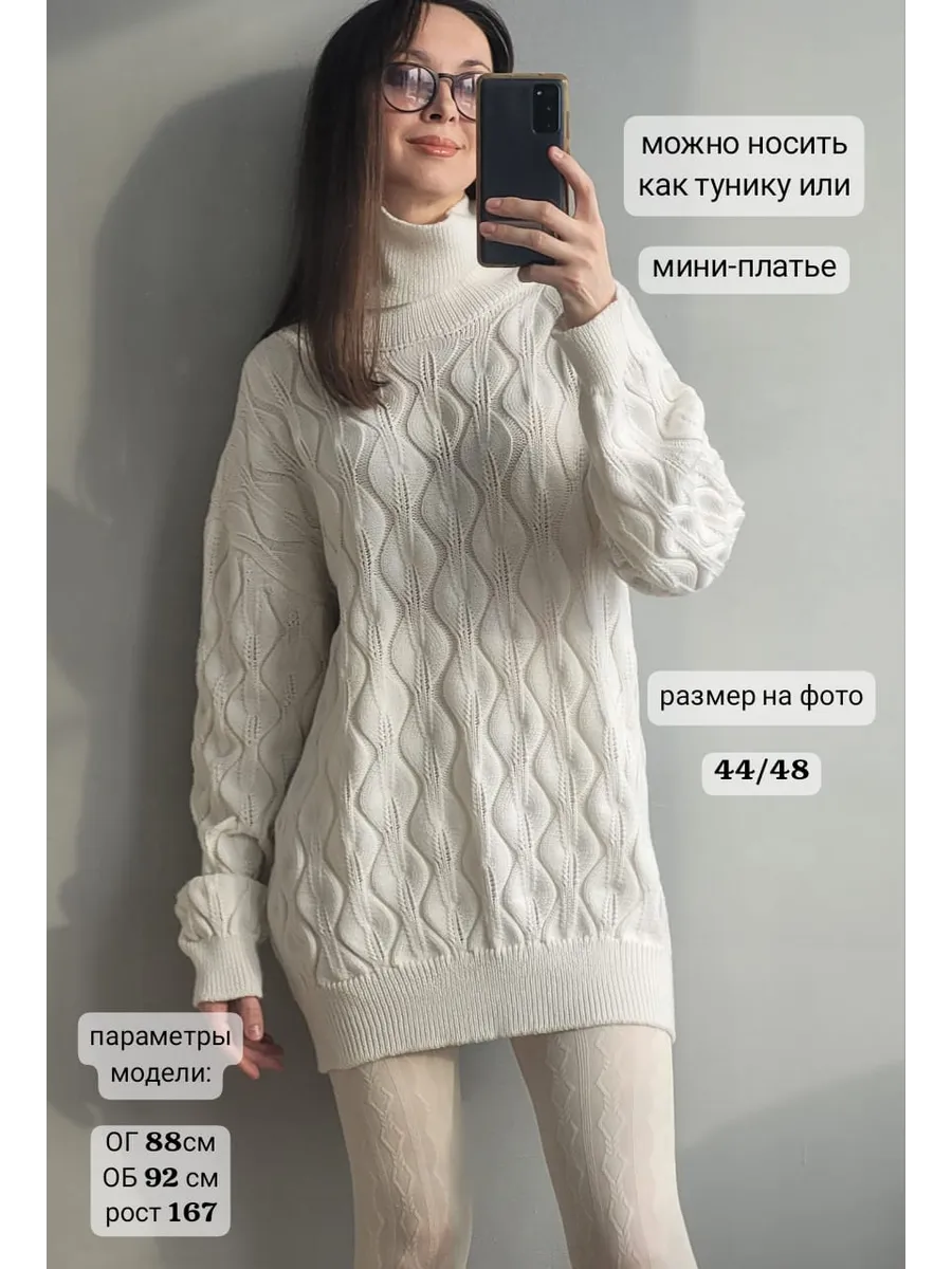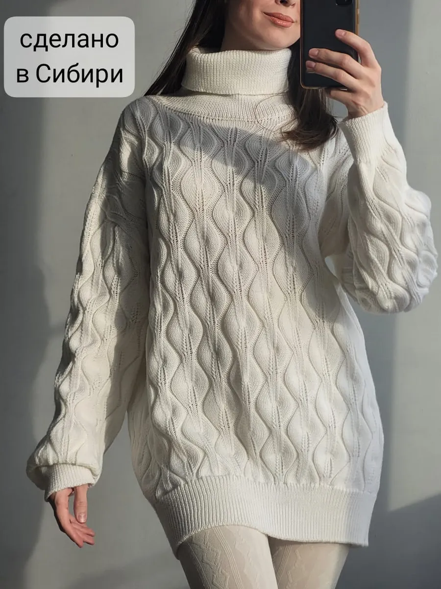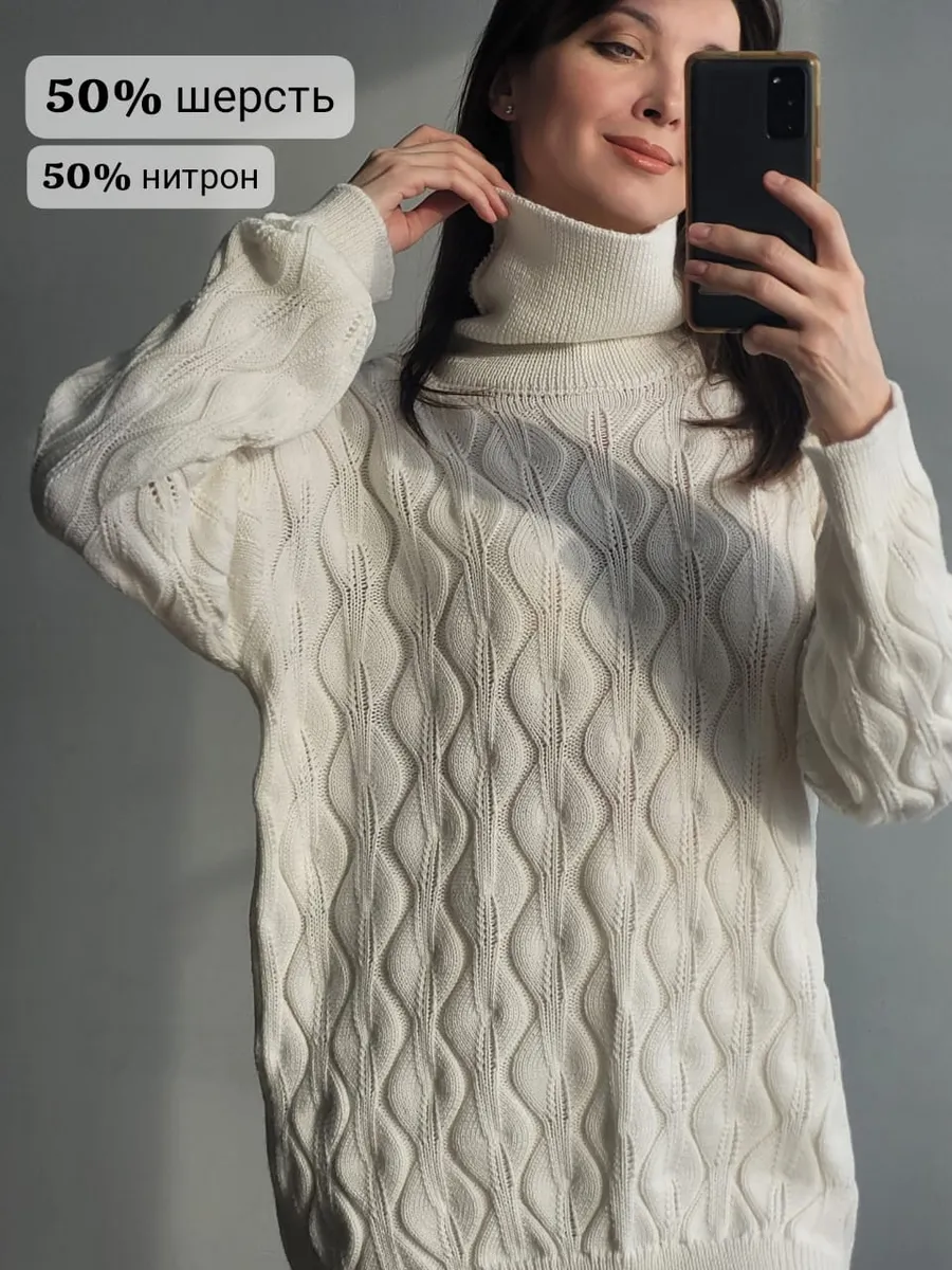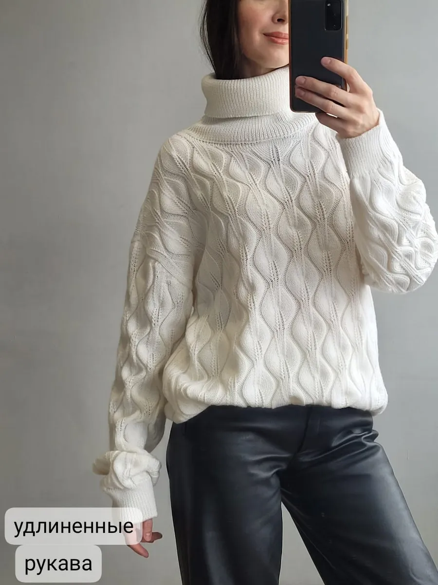 Джемпер-оверсайз свободного кроя, стильный и уютный, с удлиненными рукавами, крупной рельефной вязки станет любимой вещью в вашем гардеробе на прохладную погоду. Джемпер с высоким воротом, можно носить, как тунику или трикотажное мини-платье, благодаря удлиненному фасону. Но с помощью удобной резинки по низу изделия можно легко играть с длиной джемпера, создавая различные образы с юбками, брюками, джинсами. Джемпер выполнен из полушерстяной пряжи, мягкий и приятный к телу, он обволакивает свои теплом. Рукава намеренно удлиненные, чтобы создать визуальный эффект объемности, оверсайзности, это придает более богатый и стильный вид.